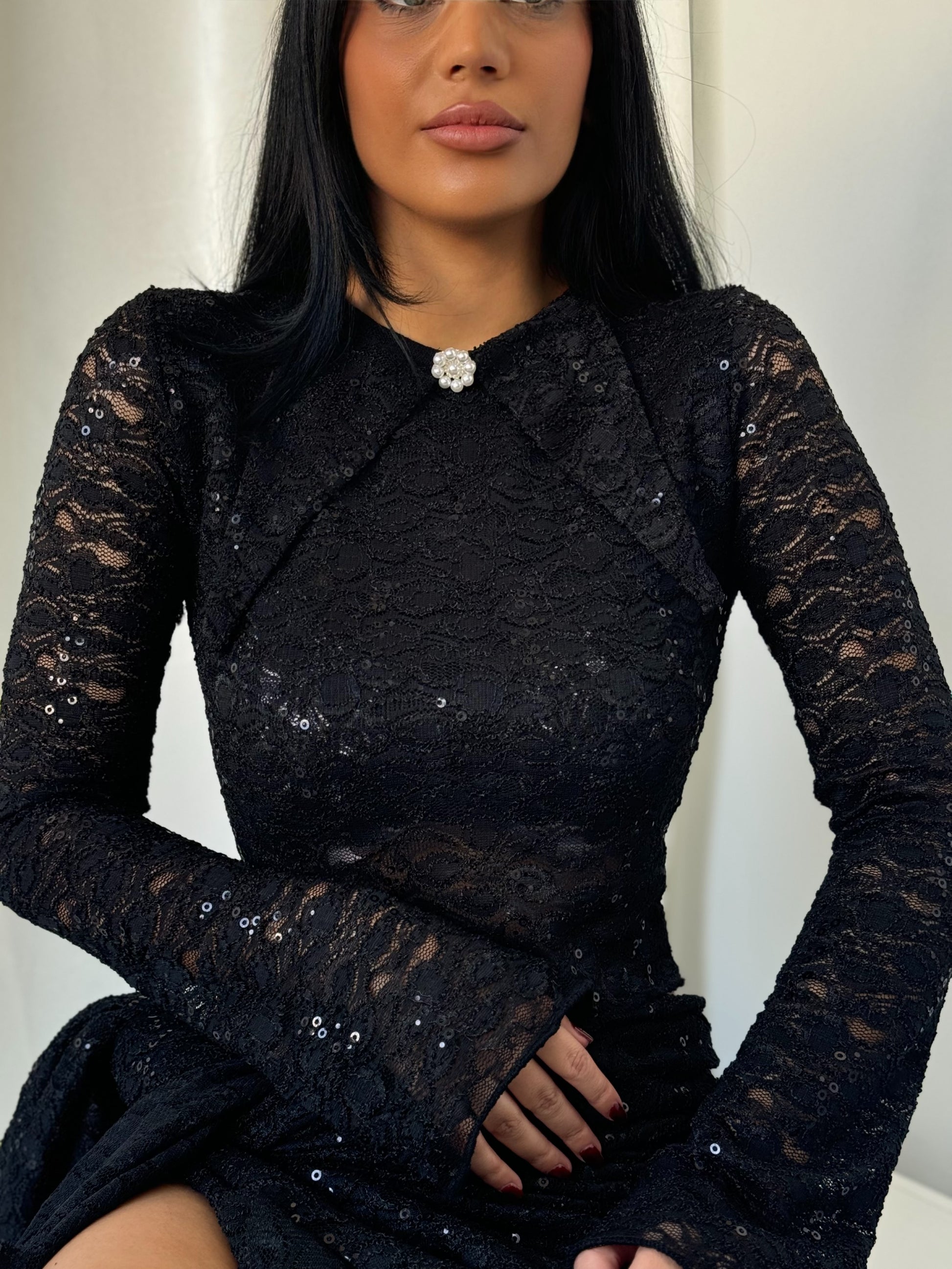 This elegant black blouse is made of a lace material. On the front, the blouse has a small flower-shaped decoration that adds a delicate touch