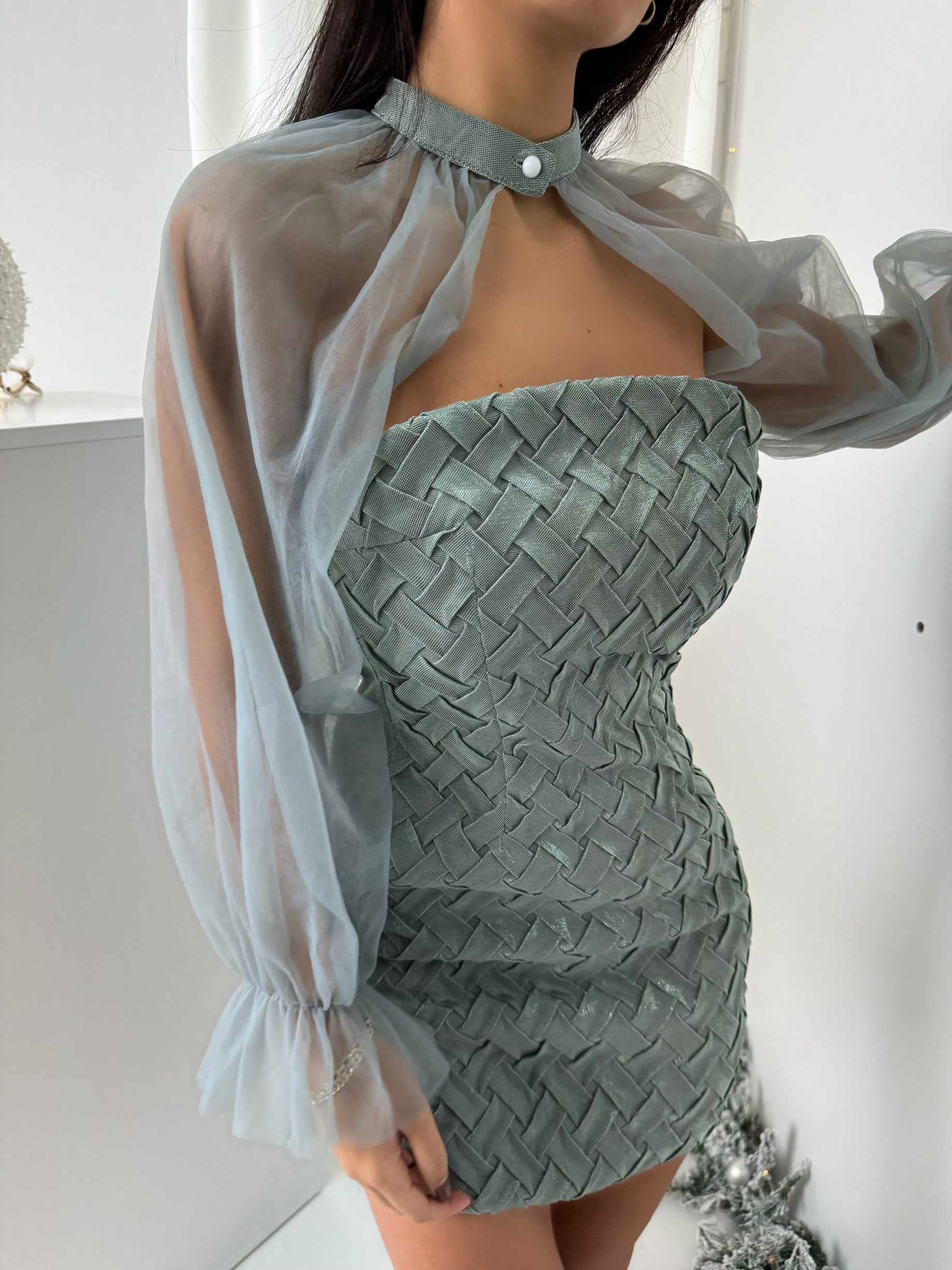 Hnewly Elegant Sexy High Waist Patchwork Mesh Lantern Long Sleeve Dress Vacation Vestidos Slim