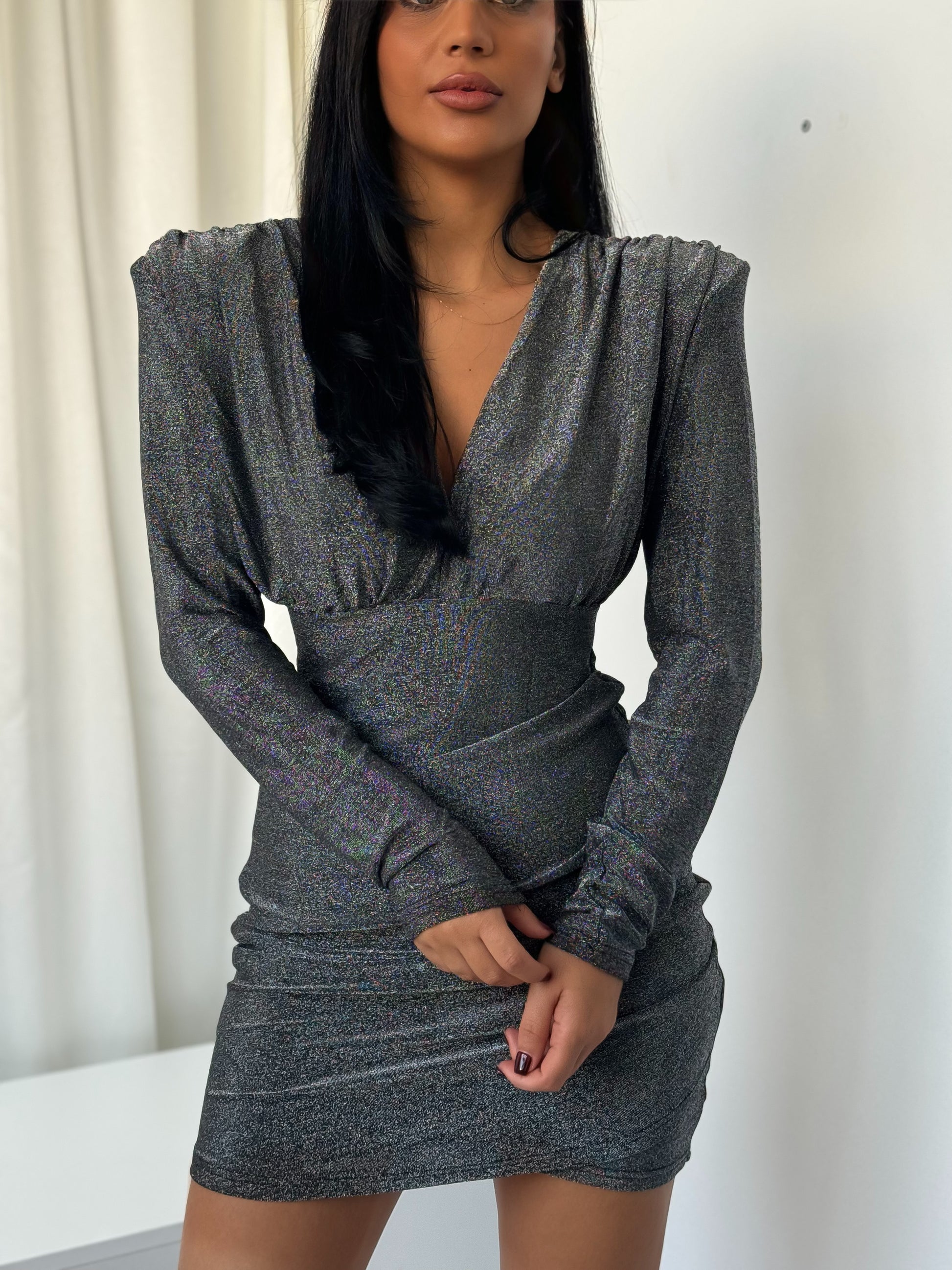 elegant and modern dress with an attractive design. The dress is metallic gray in color and has a slight sheen that makes it look very luxurious.