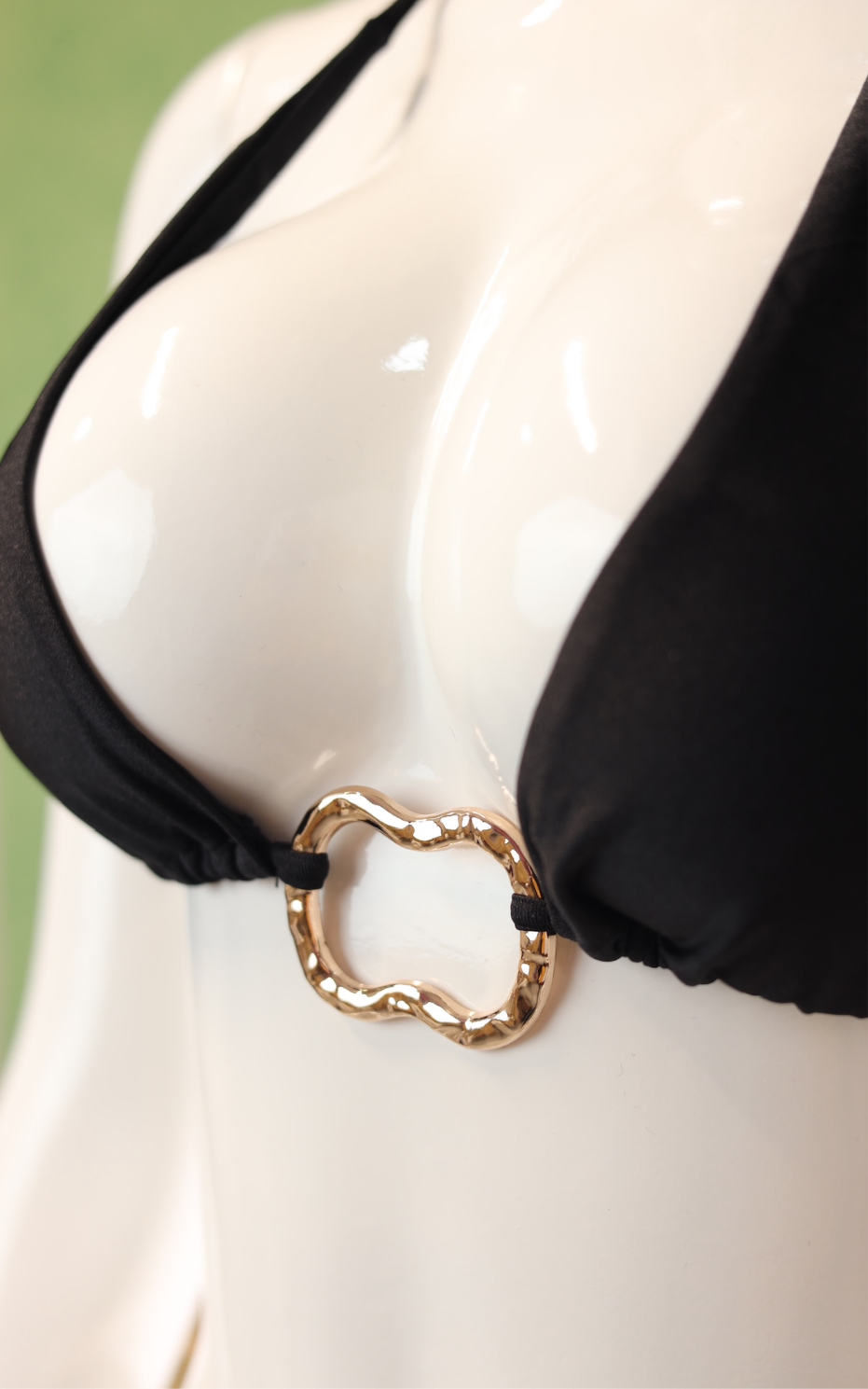 Turn heads this summer with our sleek black bikini featuring unique gold-tone flower rings.