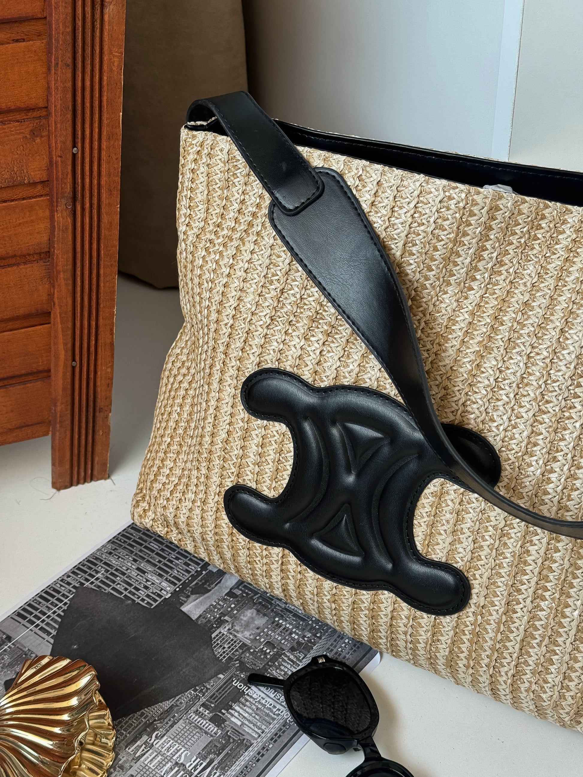 Elegant Woven Straw Shoulder Bag with Black Leather Accent