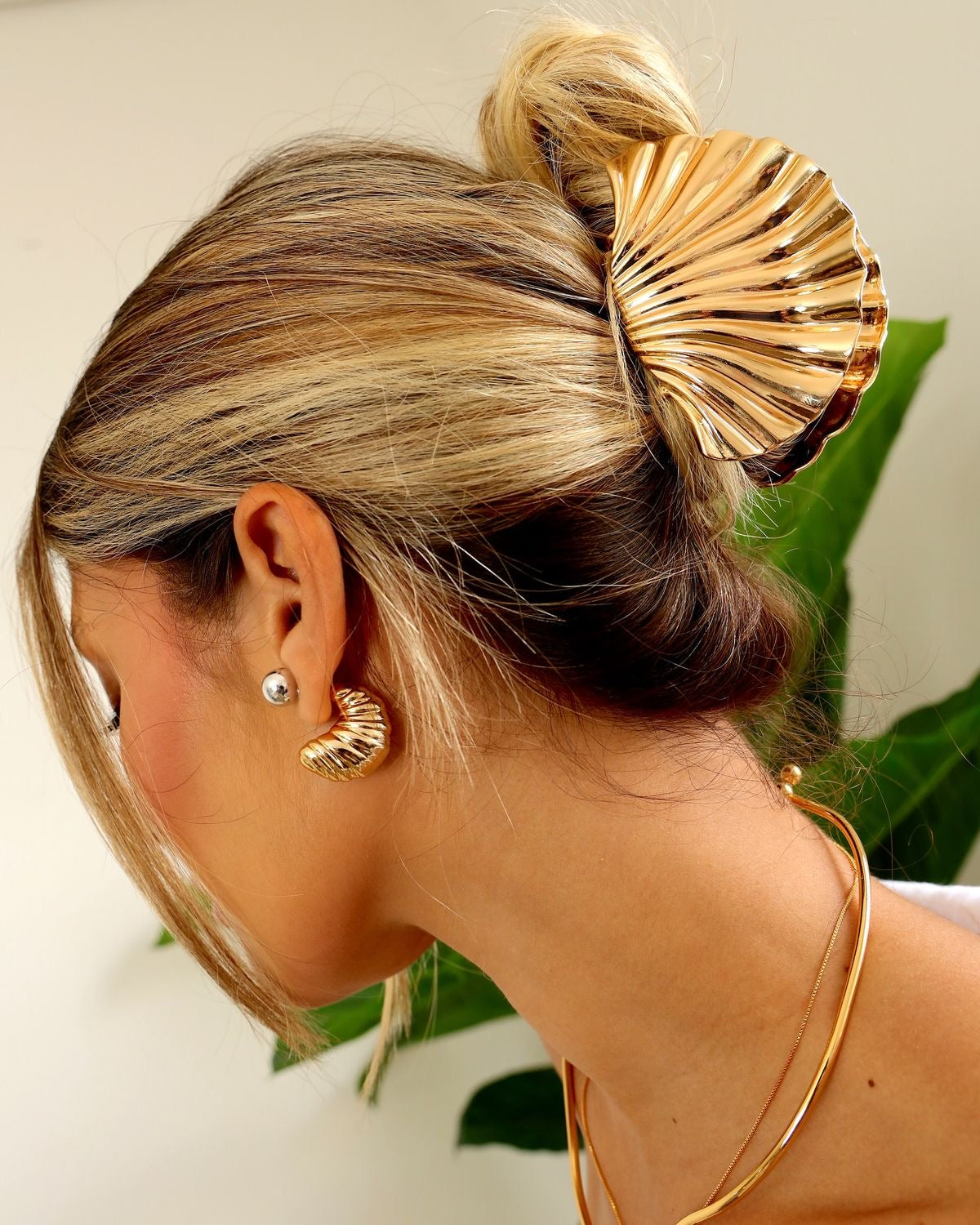 Enhance your hairstyle with our Gold Shell Hair Claw Clip. Made with high-quality materials, it securely holds hair in place for all-day wear. Add a touch of elegance and elevate your look with its beautiful shell design. Perfect for all hair types, this clip is a must-have for any fashion-forward individual.