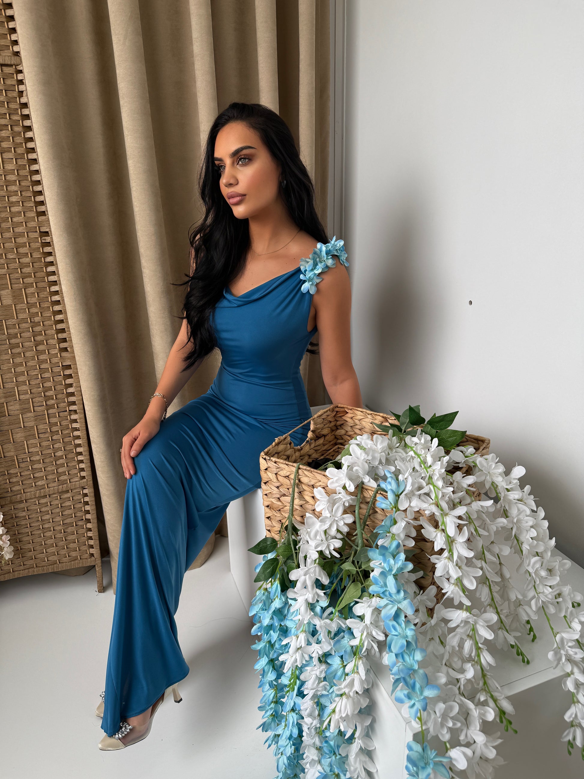 This model features a long, fitted blue dress that exudes simple elegance. The special detail is the decorative flower placed on the left shoulder, which adds a unique touch. The design of the dress is suitable for formal occasions and special events.