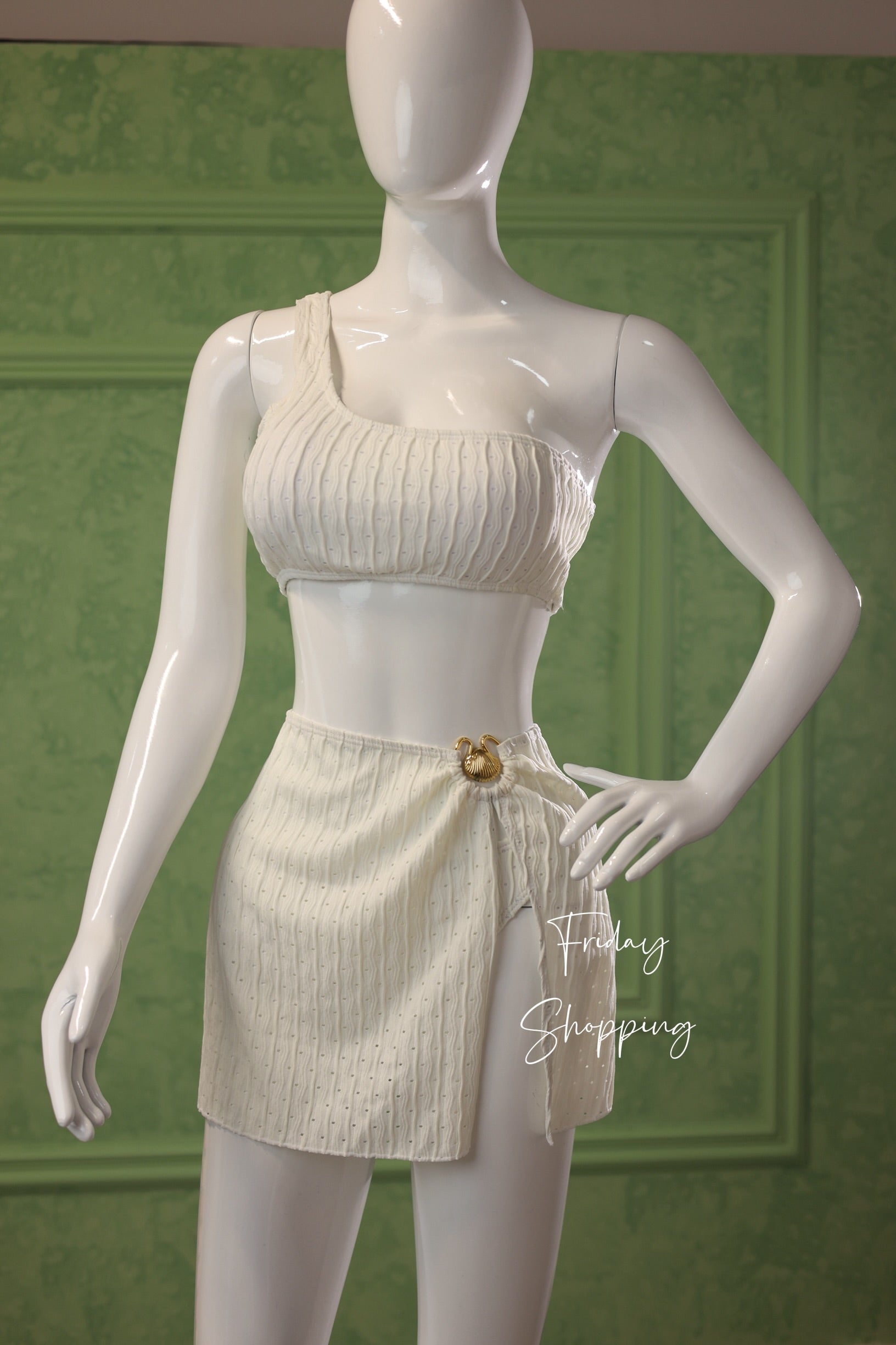 Stay effortlessly chic with this stylish one-shoulder top and wrap mini skirt combo in a textured white fabric.