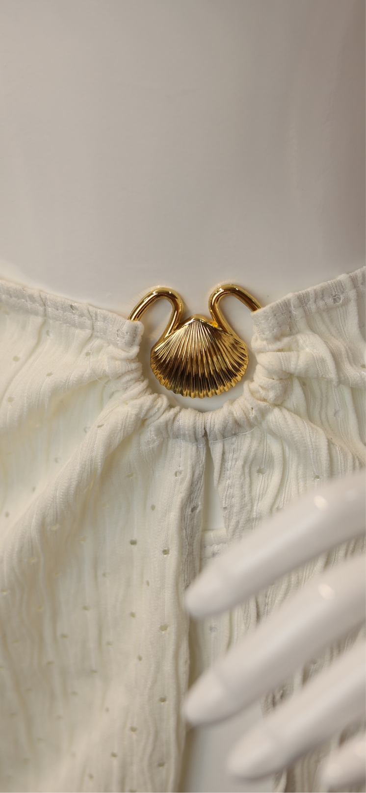 Decorated with a gold seashell detail at the waist, this set is perfect for beach strolls, summer parties, or poolside glam