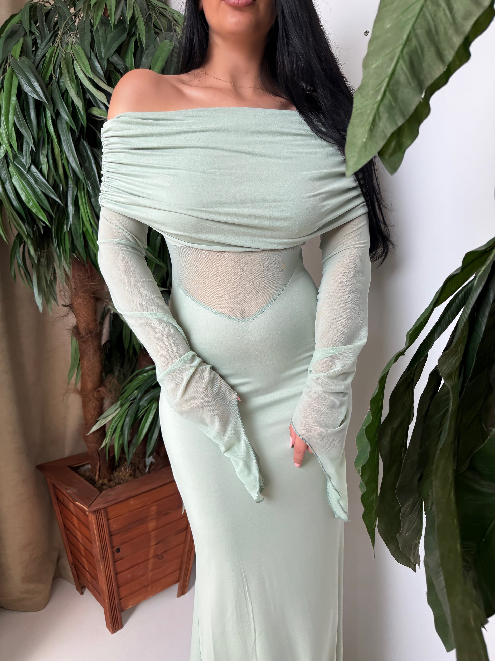 Radiate elegance and grace with this pastel mint long dress.