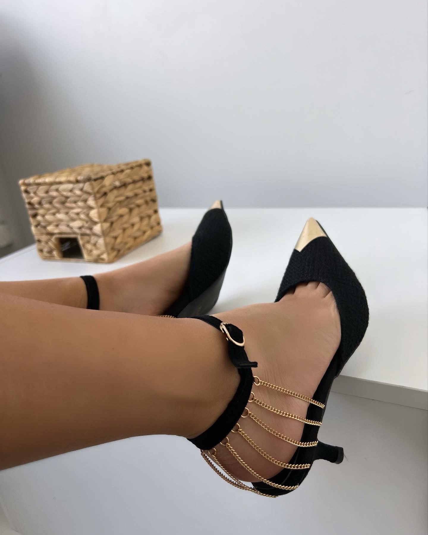 showcases an elegant pair of black high-heeled shoes with pointed toes, gold chain ankle straps, and a metallic gold tip at the front.
