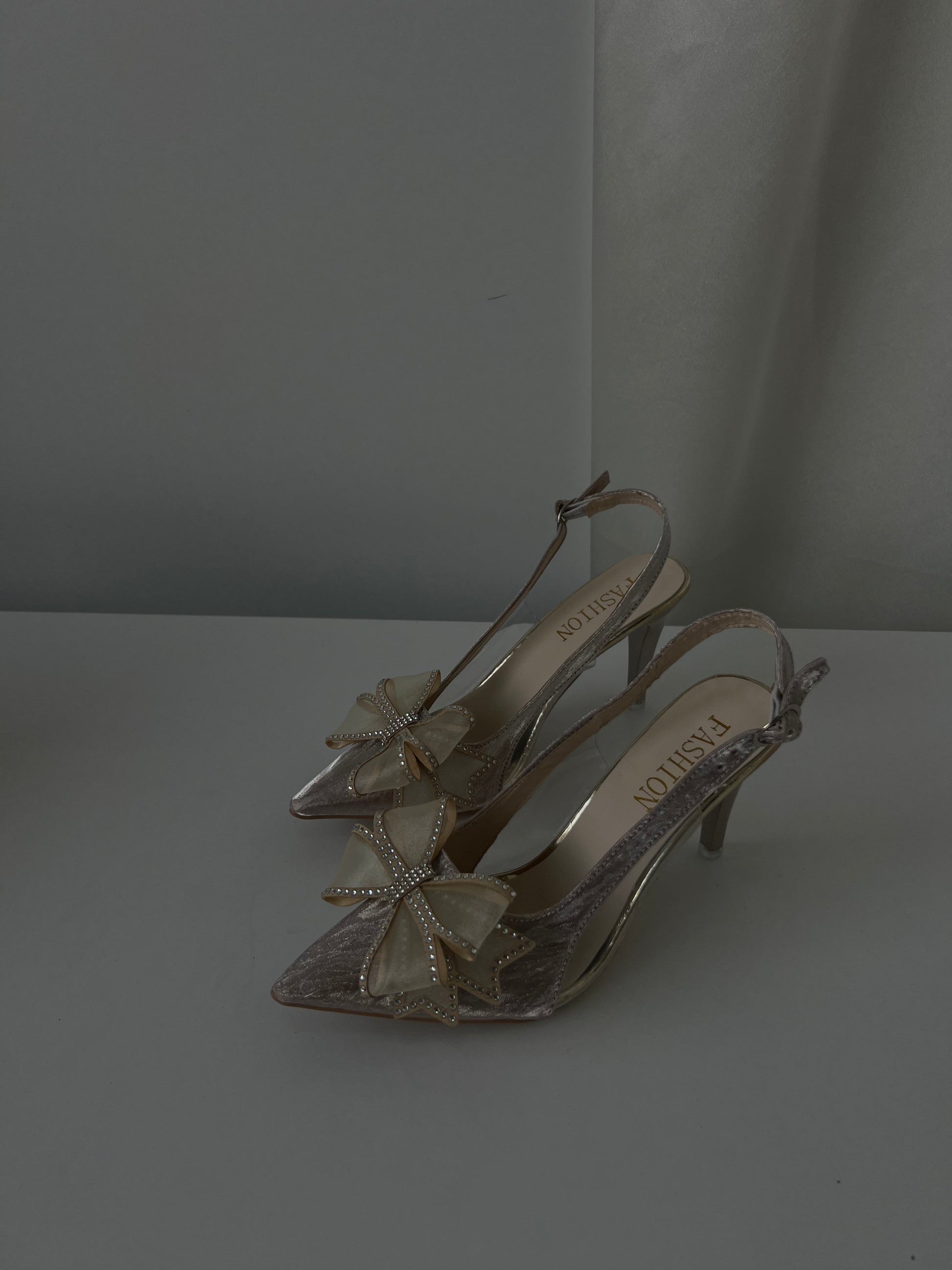The shoes are silver with a pointed toe design and feature a decorative bow on the front, embellished with pearls and sheer fabric. These sophisticated shoes are part of the Perfect for adding a touch of glamour to any outfit! 🌟