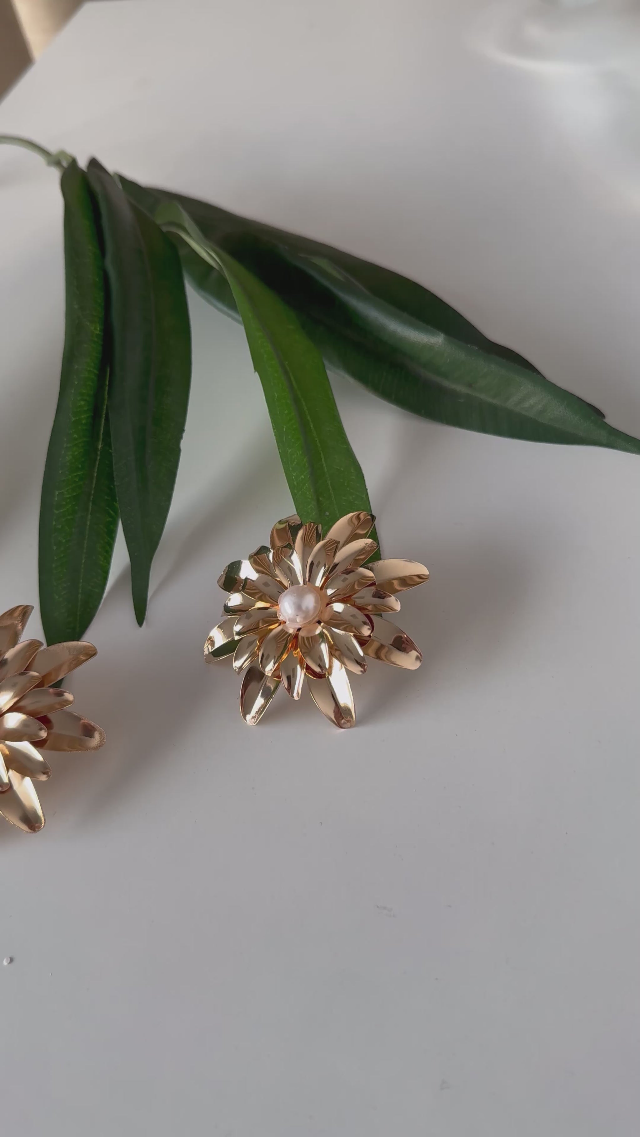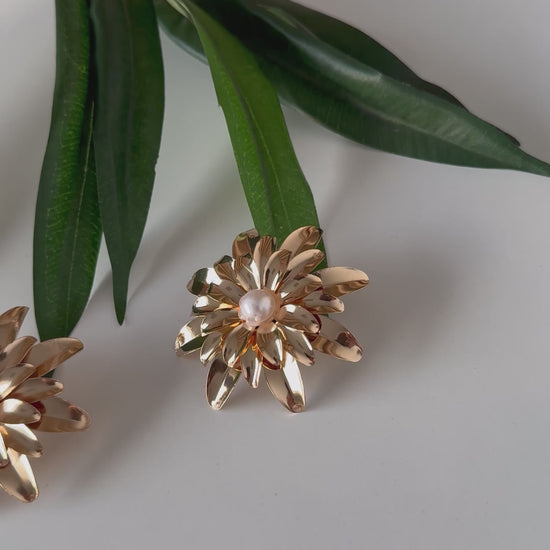 Make a bold impression with these stunning gold flower earrings. Featuring a layered petal design with a luminous pearl at the center, these earrings are perfect for adding a touch of luxury and elegance to any outfit.