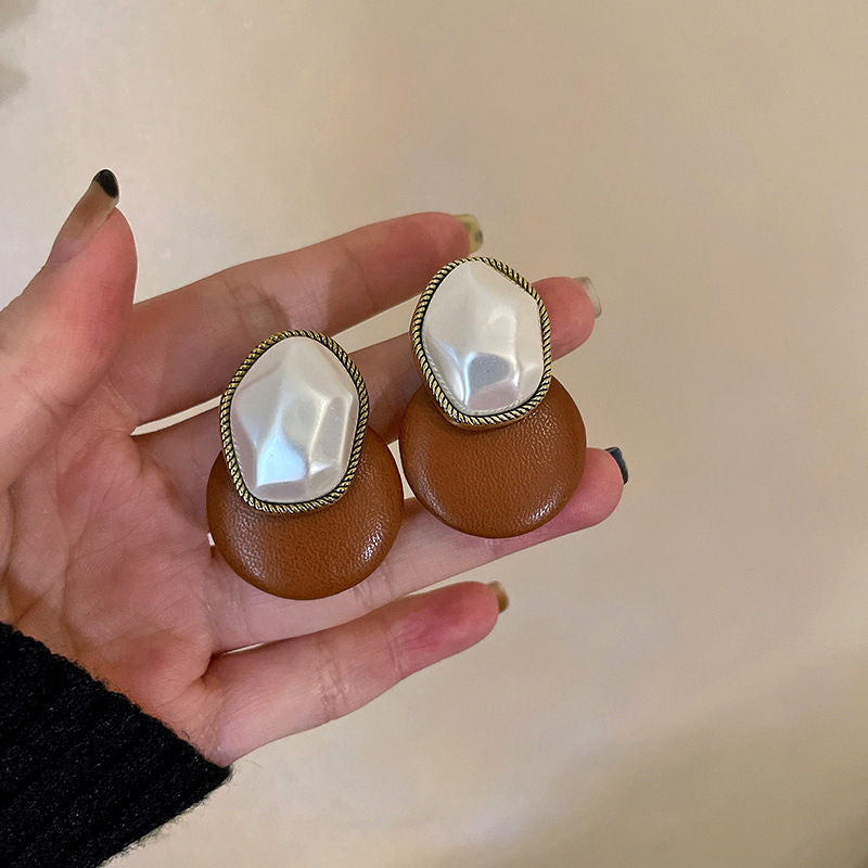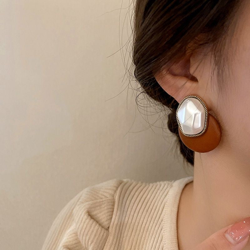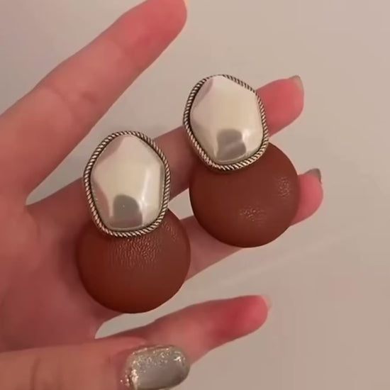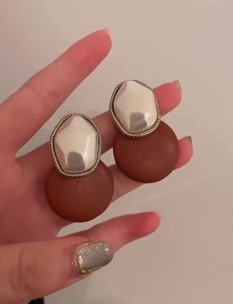 These exquisite earrings combine the beauty of a shimmering white stone with the warmth of brown leather. Framed by a twisted gold-tone metal, the contrast in textures and colors creates a bold yet sophisticated look. Perfect for those who seek accessories that stand out, these earrings add a touch of modern charm to any outfit.