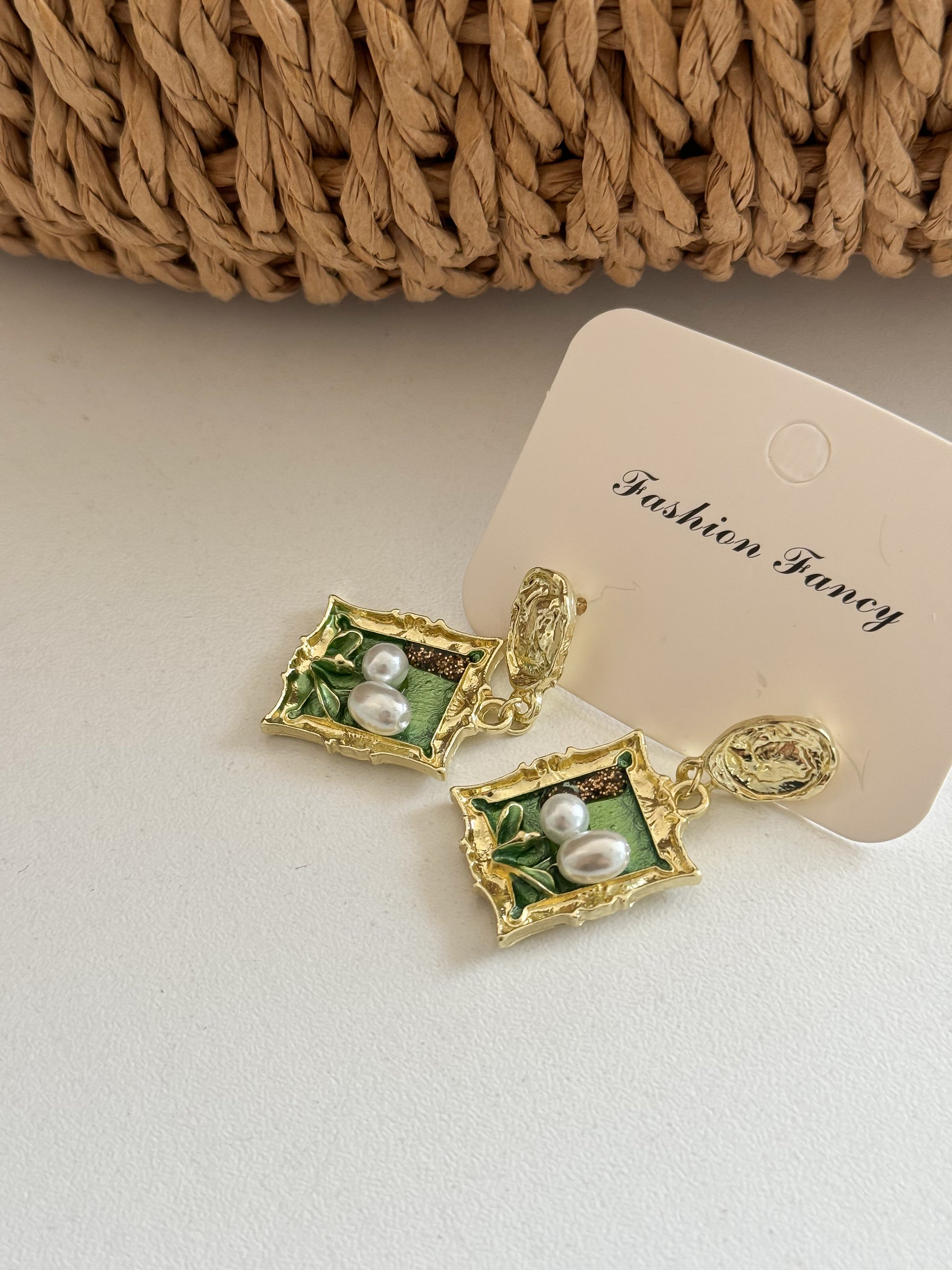 Add a touch of timeless elegance to your look with these vintage-inspired drop earrings. Featuring a textured gold-tone stud, a green enamel oval pendant, and delicate pearl accents, these earrings are perfect for elevating both everyday outfits and evening wear.